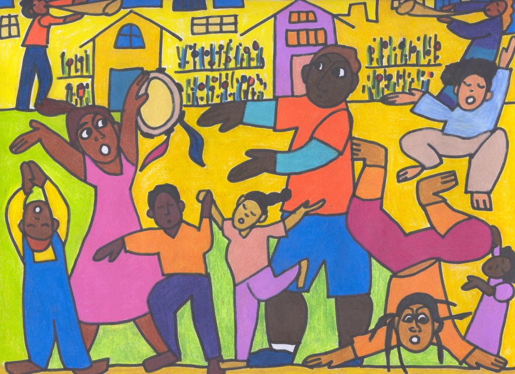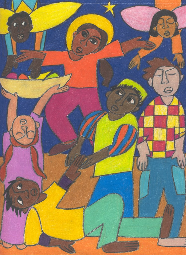 This drawing shows people and angels offering food and help (a hand up) to others. Let’s look for opportunities in our own lives to lift people up and make sure they have the food and other necessities of life they need. Let’s use our imaginations to figure out how to do justice, love mercy, and walk humbly. YES, WE CAN!