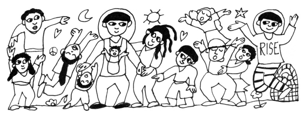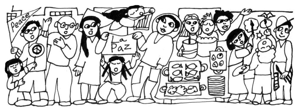These next three visuals present what I am calling “banners”–so far, just black & white ink drawings, but images evocative of our mission and our purpose. The one above depicts the risen Jesus appearing to and comforting his beloved followers. The next two (below) are Kingdom images, showing people eating, serving, and fellowshipping together; making music; painting; and demonstrating for peace.
